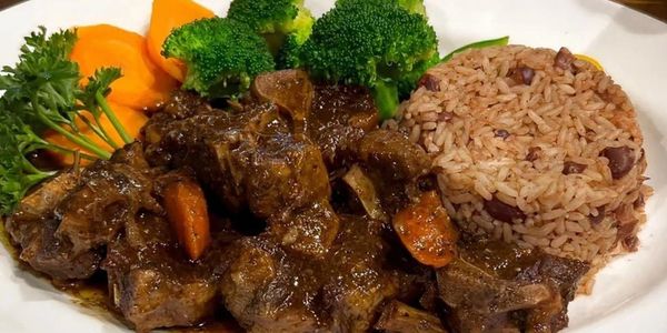 Tender, slow-braised oxtail cooked down in brown gravy with butter beans, fresh herbs, and island spices